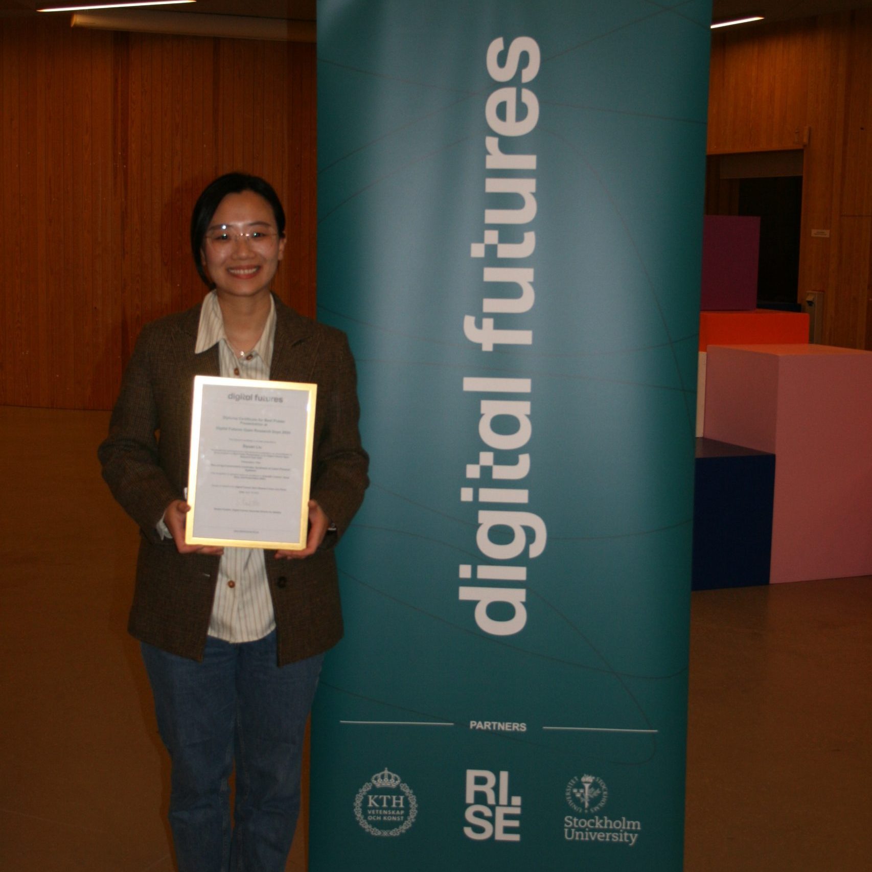 The event also hosted a postdoc poster session showcasing innovative research endeavours. The best poster was announced based on scientific content, visual style, and presentation. It was awarded to Siyuan Liu for her presentation of her “Secure-by-Construction Controller Synthesis of Cyber-Physical Systems” project. A panel discussion, moderated by Digital Futures Director Karl H Johansson, on “Trustworthy AI in an Uncertain World” rounded off the first day, featuring distinguished panellists from various disciplines. Participants had the chance to network and mingle, fostering collaboration and knowledge exchange in the field of Digital Futures research.